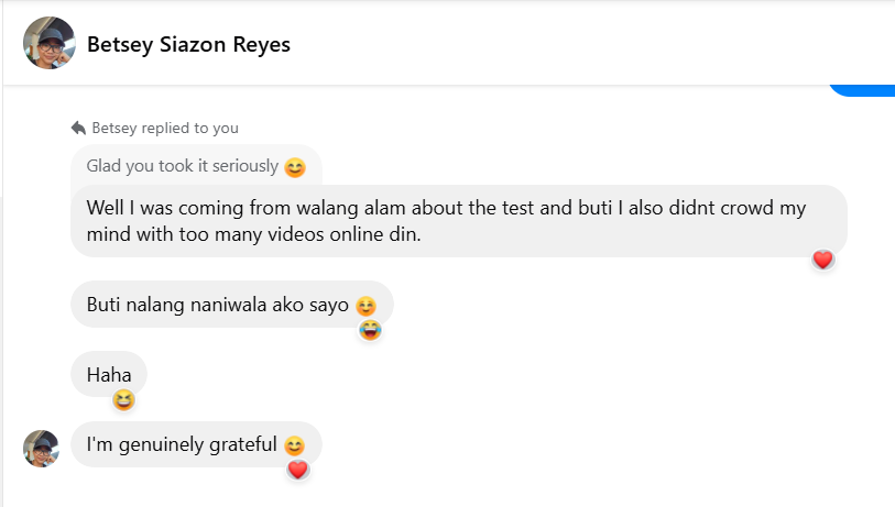 “Wala akong alam sa test — buti na lang naniwala ako sayo.”